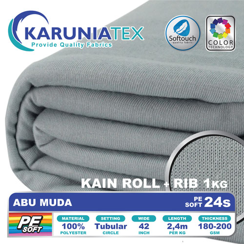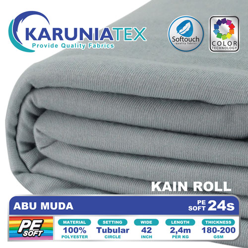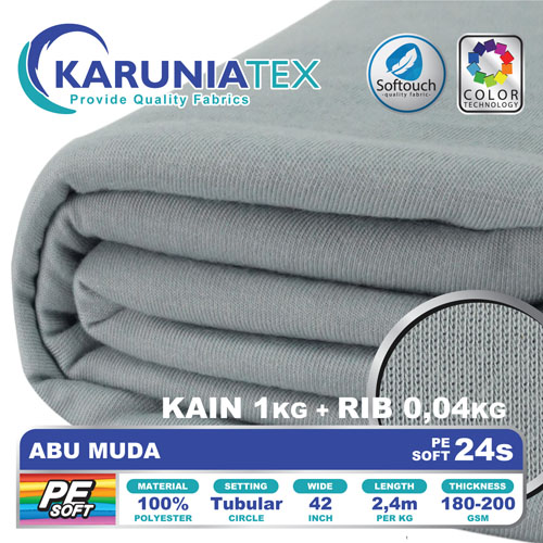 PE Soft 24s merupakan bahan kaos dengan kandungan 100% polyester. Diproduksi menggunakan teknologi softouch membuat bahan kaos ini memiliki handfeel yang halus dan lembut sehingga akan nyaman ketika digunakan. Tersedia dalam banyak pilihan warna yang sempurna, cerah dan anti pudar.