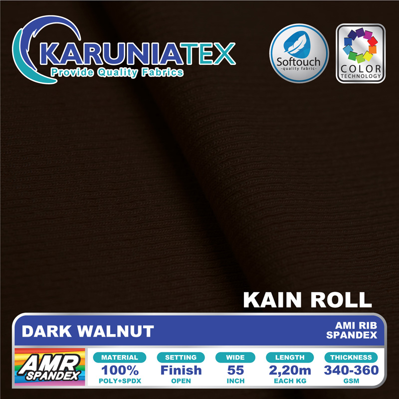 Ami Rib Spandex adalah jenis kain rib knit berkualitas tinggi dengan ciri khas tekstur garis pada permukaannya. Perpaduan material polyester dan spandex menjadikan bahan rib knit ini sangat elastis, namun tetap kuat dan awet. Dengan karakteristik yang lembut, jatuh, tebal, dan tidak menerawang.