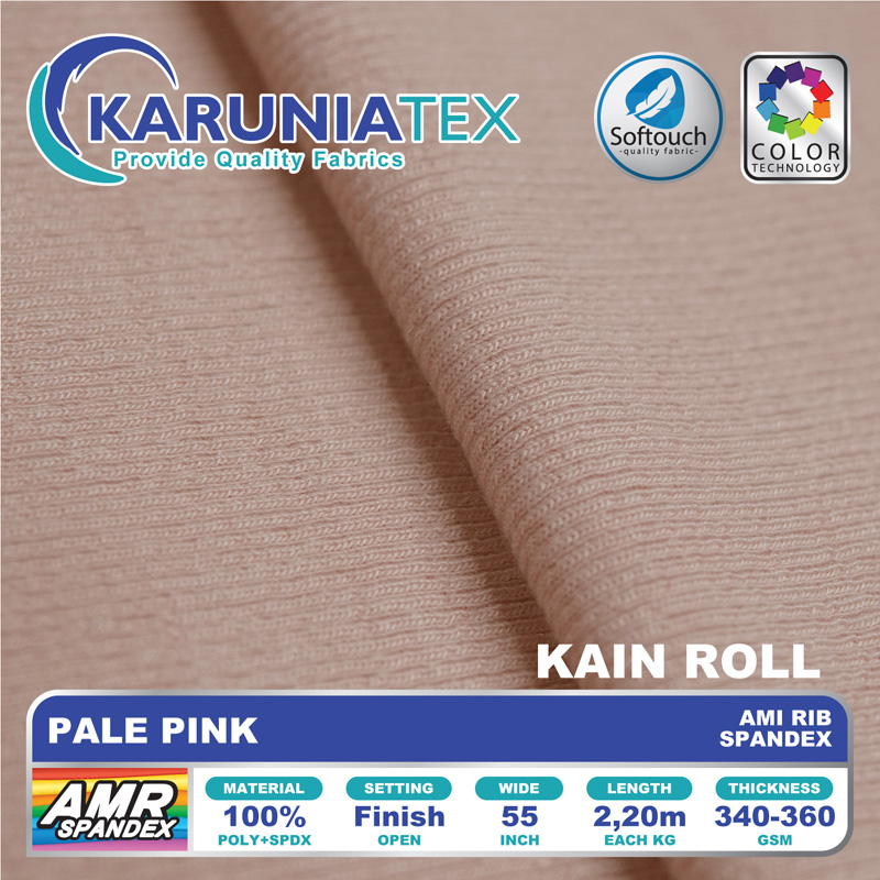 Ami Rib Spandex adalah jenis kain rib knit berkualitas tinggi dengan ciri khas tekstur garis pada permukaannya. Perpaduan material polyester dan spandex menjadikan bahan rib knit ini sangat elastis, namun tetap kuat dan awet. Dengan karakteristik yang lembut, jatuh, tebal, dan tidak menerawang.