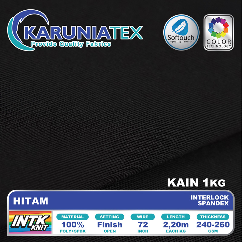 Kain Interlock Spandex adalah kain double knit dengan elastisitas tinggi (4 ways stretch). Kain ini tebal & awet, serta memiliki permukaan luar-dalam yang sama halusnya. Teksturnya yang lembut, padat, dan menyerap keringat membuatnya terasa sangat nyaman saat bersentuhan dengan kulit.