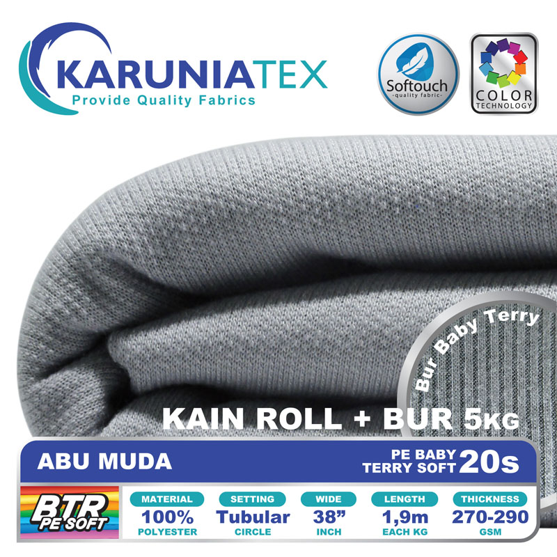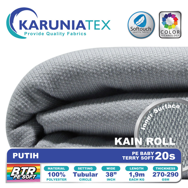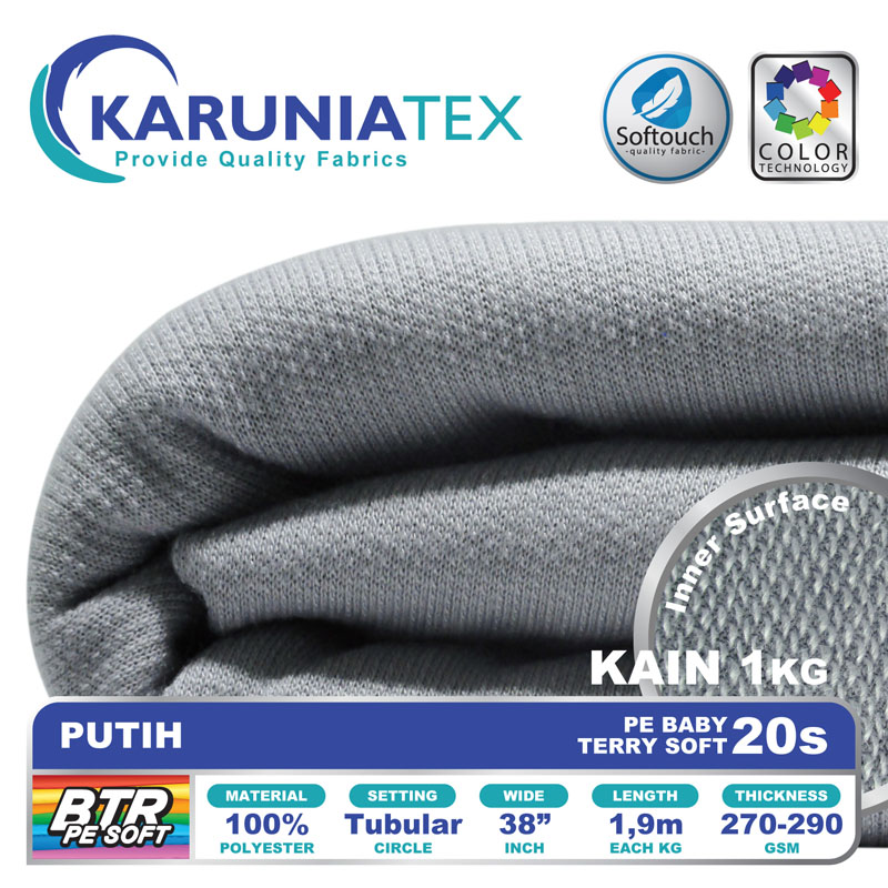 Bahan PE Baby Terry Soft adalah bahan dengan tekstur permukaan luar seperti kaos pada umumnya. Namun pada bagian dalam memiliki tekstur berbeda dengan bentuk seperti lingkaran kecil yang berulang (loop). Memiliki komposisi 100% polyester, melalui proses produksi dengan teknologi softouch membuat PE Baby Terry soft mempunyai look premium dengan karakter handfeel yang halus dan lembut.