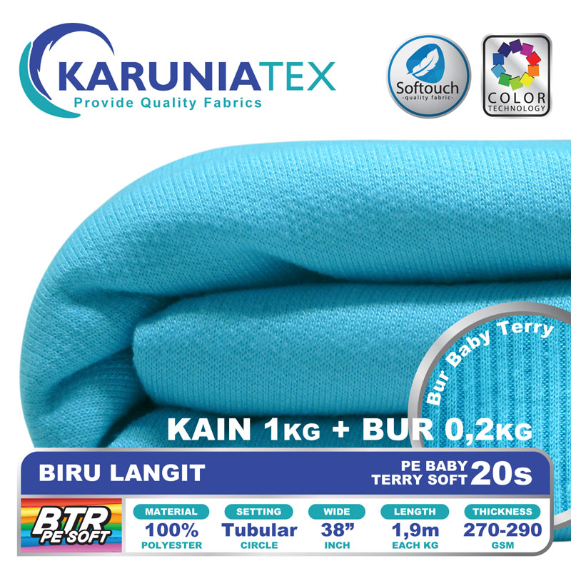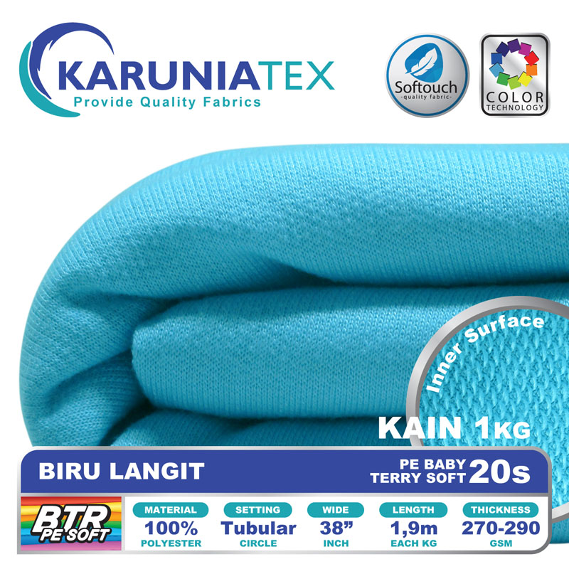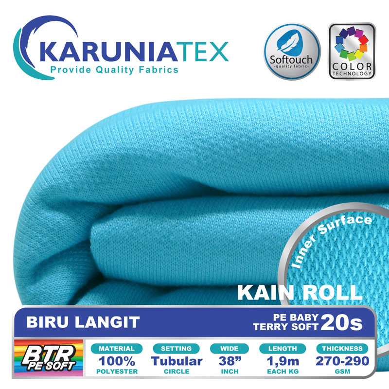 Bahan PE Baby Terry Soft adalah bahan dengan tekstur permukaan luar seperti kaos pada umumnya. Namun pada bagian dalam memiliki tekstur berbeda dengan bentuk seperti lingkaran kecil yang berulang (loop). Memiliki komposisi 100% polyester, melalui proses produksi dengan teknologi softouch membuat PE Baby Terry soft mempunyai look premium dengan karakter handfeel yang halus dan lembut.