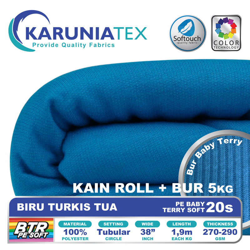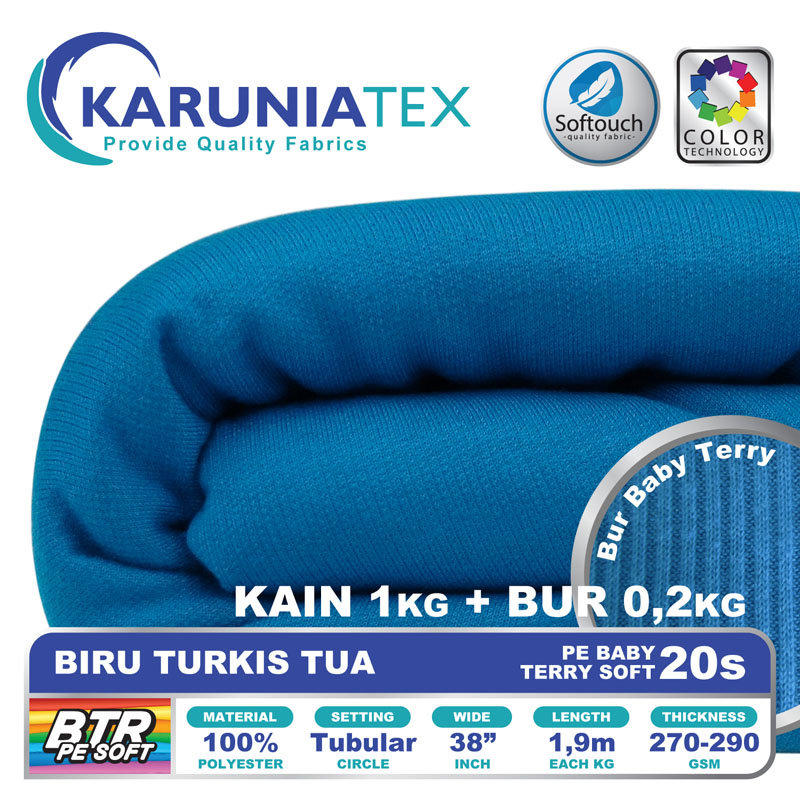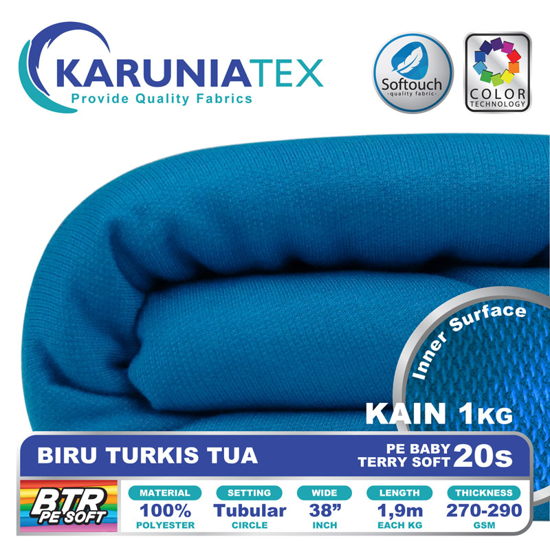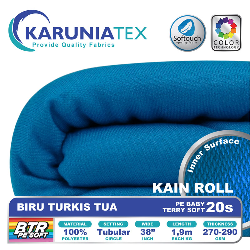 Bahan PE Baby Terry Soft adalah bahan dengan tekstur permukaan luar seperti kaos pada umumnya. Namun pada bagian dalam memiliki tekstur berbeda dengan bentuk seperti lingkaran kecil yang berulang (loop). Memiliki komposisi 100% polyester, melalui proses produksi dengan teknologi softouch membuat PE Baby Terry soft mempunyai look premium dengan karakter handfeel yang halus dan lembut.