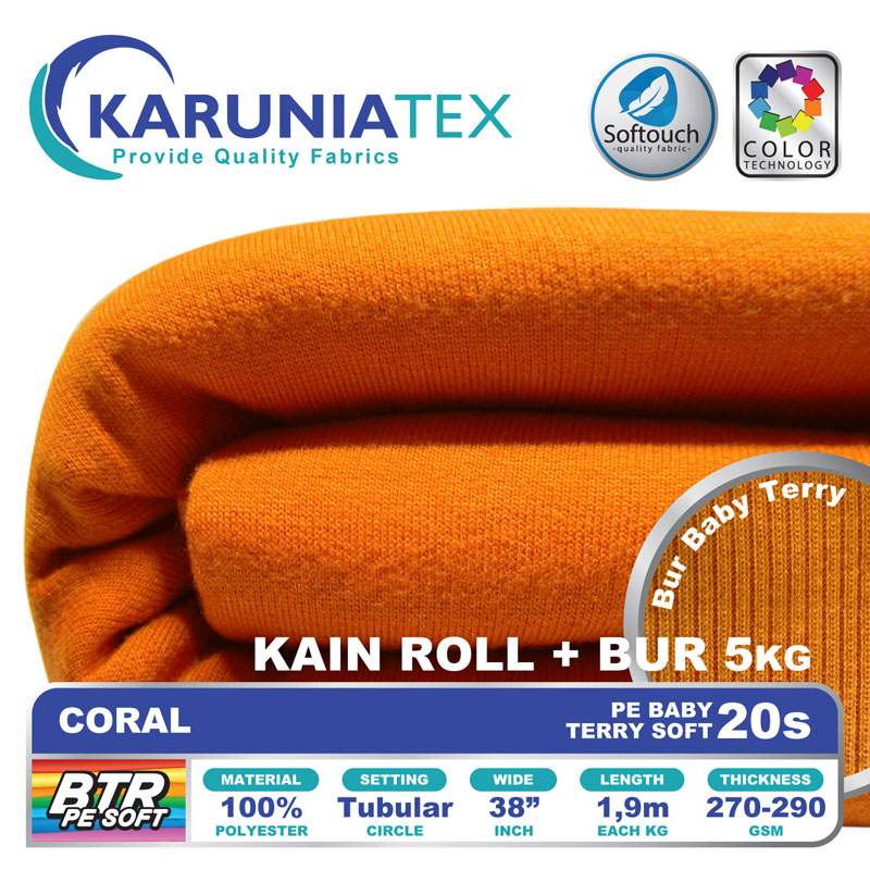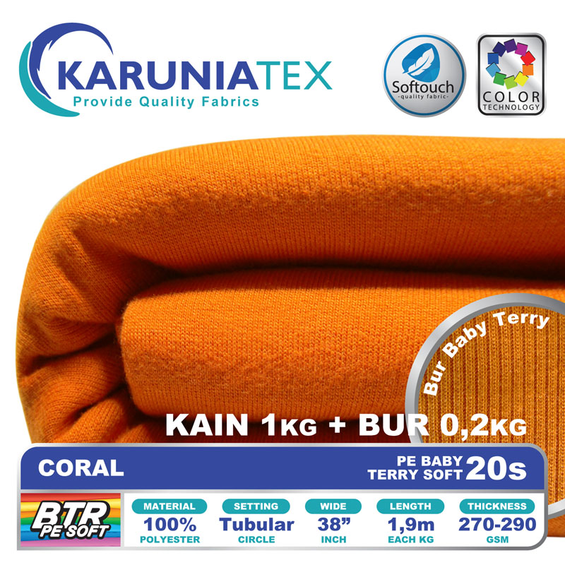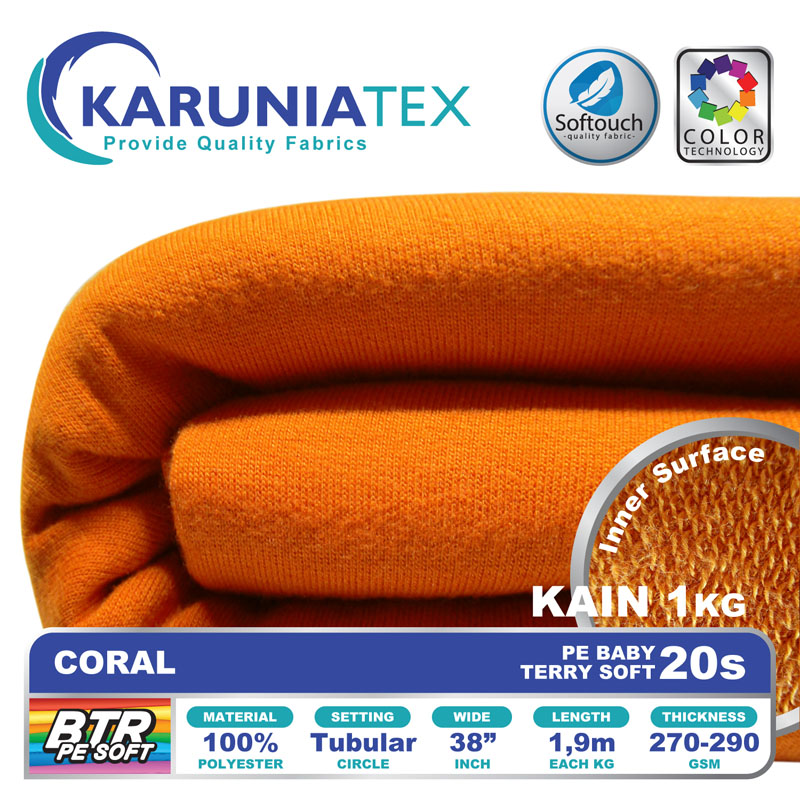 Bahan PE Baby Terry Soft adalah bahan dengan tekstur permukaan luar seperti kaos pada umumnya. Namun pada bagian dalam memiliki tekstur berbeda dengan bentuk seperti lingkaran kecil yang berulang (loop). Memiliki komposisi 100% polyester, melalui proses produksi dengan teknologi softouch membuat PE Baby Terry soft mempunyai look premium dengan karakter handfeel yang halus dan lembut.