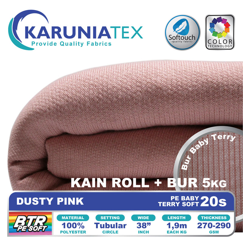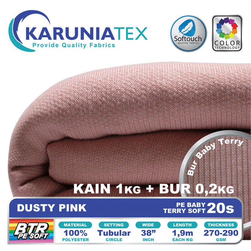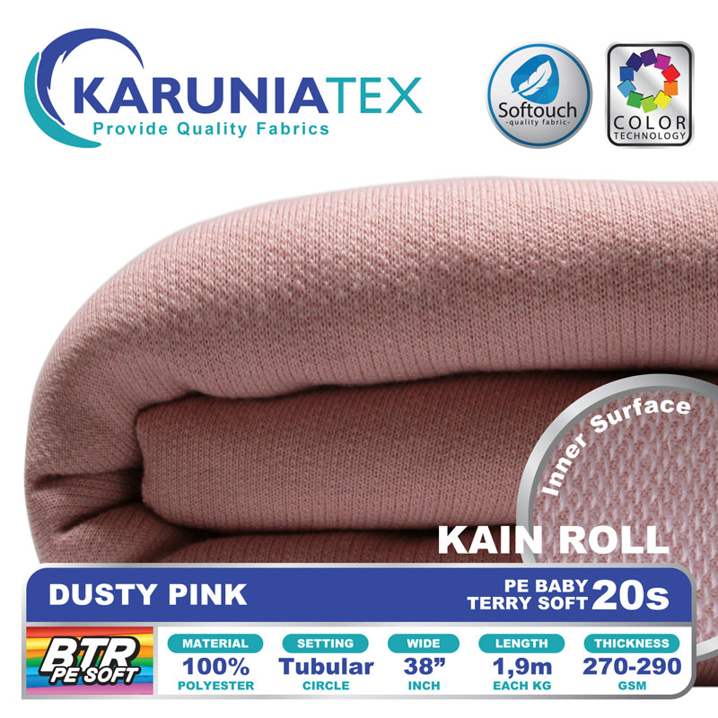 Bahan PE Baby Terry Soft adalah bahan dengan tekstur permukaan luar seperti kaos pada umumnya. Namun pada bagian dalam memiliki tekstur berbeda dengan bentuk seperti lingkaran kecil yang berulang (loop). Memiliki komposisi 100% polyester, melalui proses produksi dengan teknologi softouch membuat PE Baby Terry soft mempunyai look premium dengan karakter handfeel yang halus dan lembut.