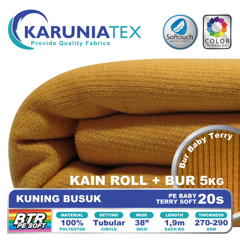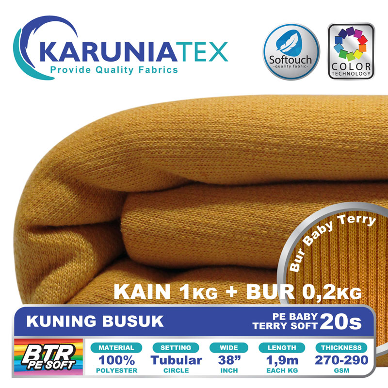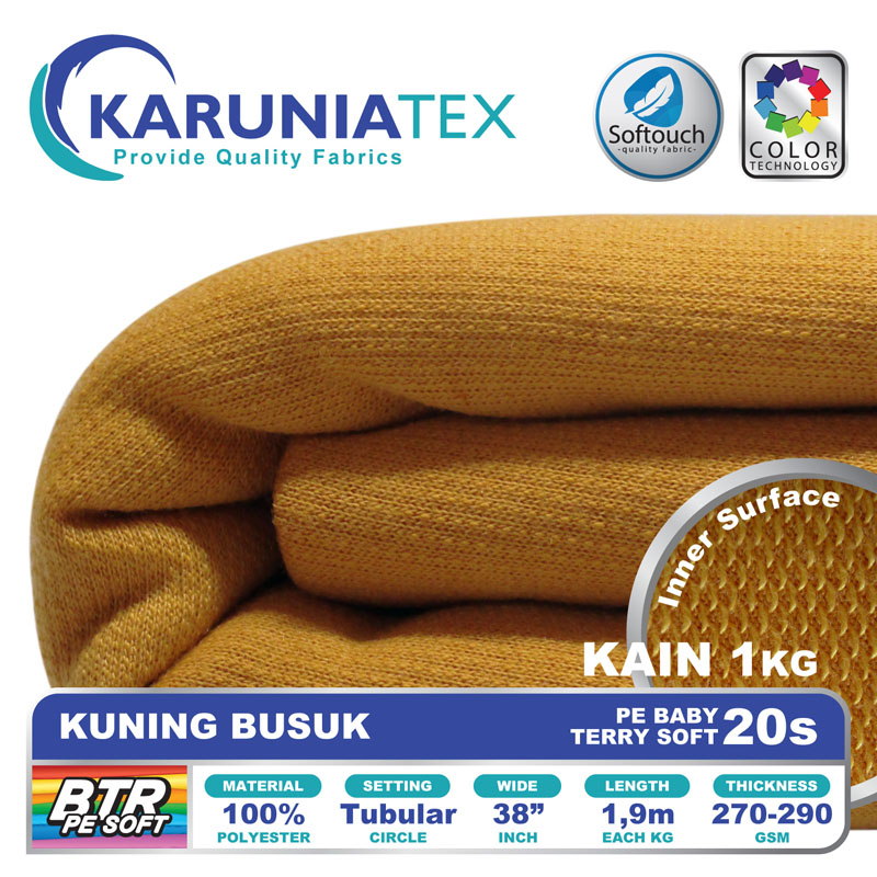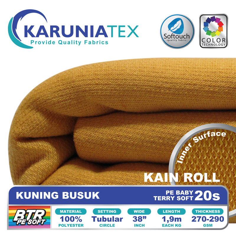 Bahan PE Baby Terry Soft adalah bahan dengan tekstur permukaan luar seperti kaos pada umumnya. Namun pada bagian dalam memiliki tekstur berbeda dengan bentuk seperti lingkaran kecil yang berulang (loop). Memiliki komposisi 100% polyester, melalui proses produksi dengan teknologi softouch membuat PE Baby Terry soft mempunyai look premium dengan karakter handfeel yang halus dan lembut.