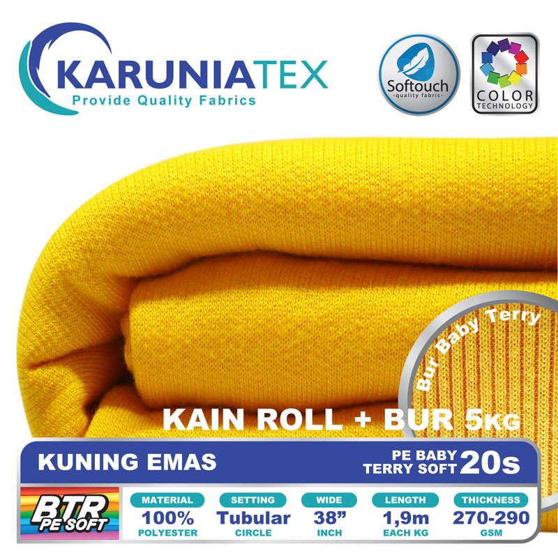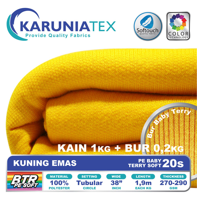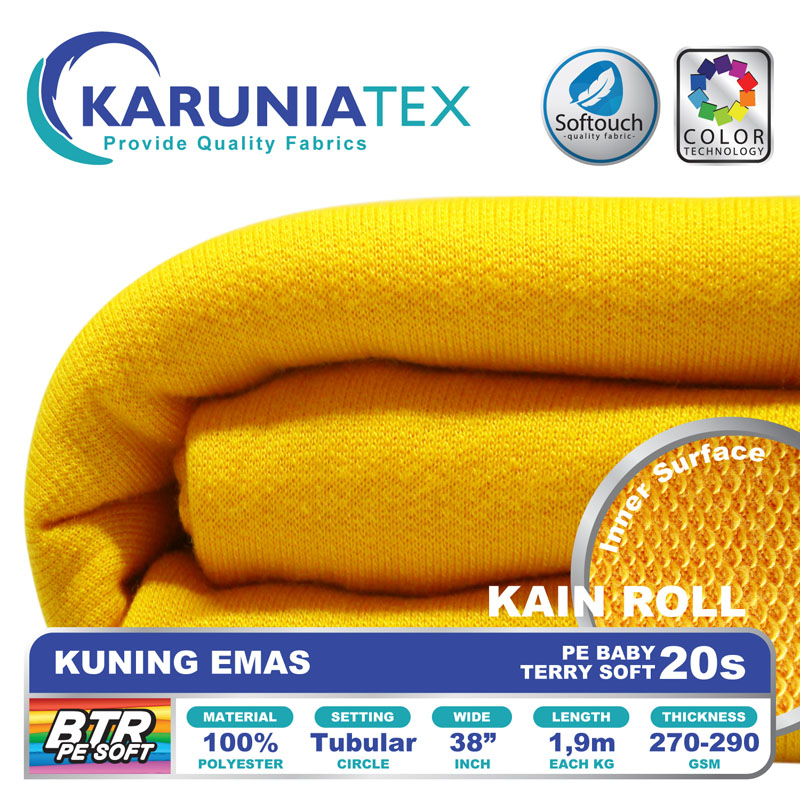 Bahan PE Baby Terry Soft adalah bahan dengan tekstur permukaan luar seperti kaos pada umumnya. Namun pada bagian dalam memiliki tekstur berbeda dengan bentuk seperti lingkaran kecil yang berulang (loop). Memiliki komposisi 100% polyester, melalui proses produksi dengan teknologi softouch membuat PE Baby Terry soft mempunyai look premium dengan karakter handfeel yang halus dan lembut.