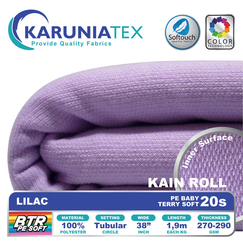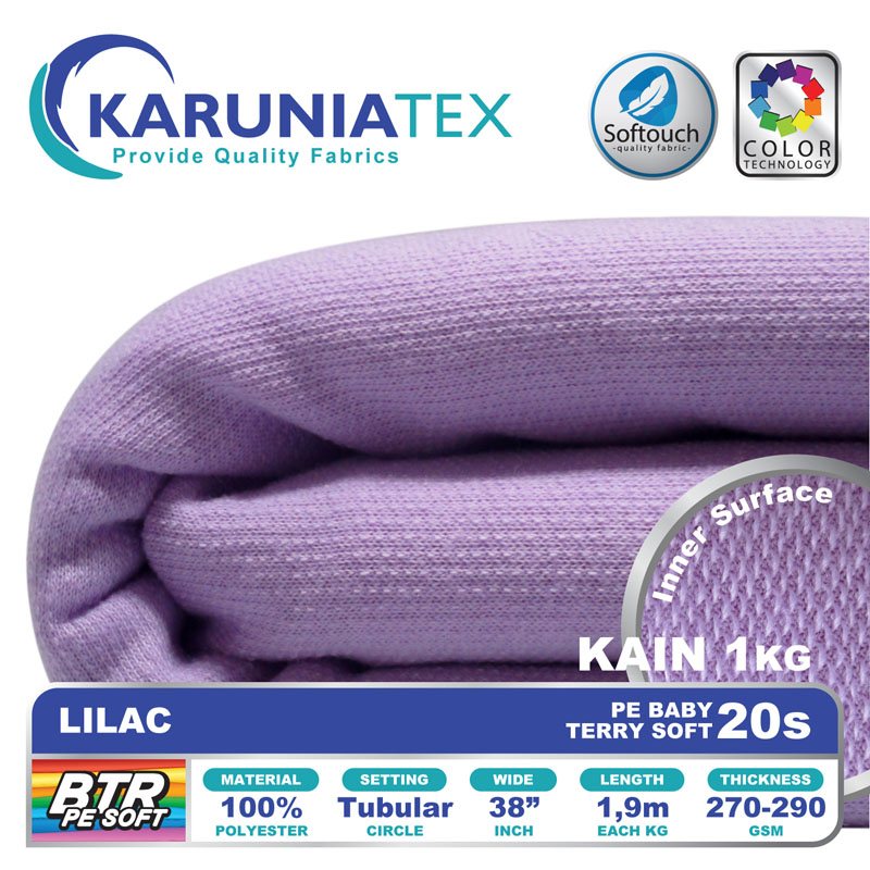 Bahan PE Baby Terry Soft adalah bahan dengan tekstur permukaan luar seperti kaos pada umumnya. Namun pada bagian dalam memiliki tekstur berbeda dengan bentuk seperti lingkaran kecil yang berulang (loop). Memiliki komposisi 100% polyester, melalui proses produksi dengan teknologi softouch membuat PE Baby Terry soft mempunyai look premium dengan karakter handfeel yang halus dan lembut.