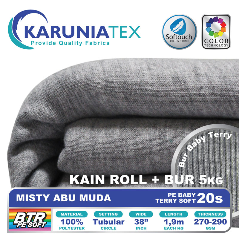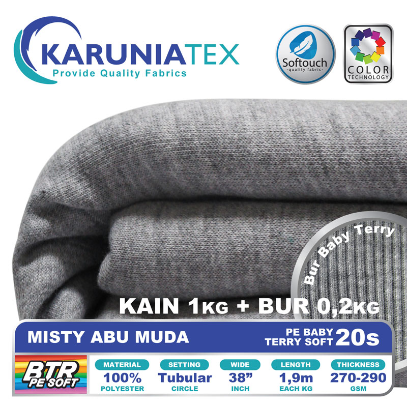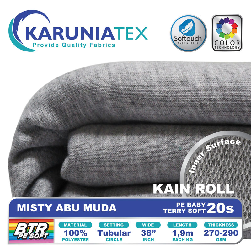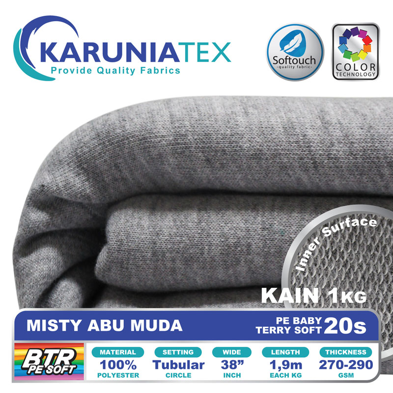 Bahan PE Baby Terry Soft adalah bahan dengan tekstur permukaan luar seperti kaos pada umumnya. Namun pada bagian dalam memiliki tekstur berbeda dengan bentuk seperti lingkaran kecil yang berulang (loop). Memiliki komposisi 100% polyester, melalui proses produksi dengan teknologi softouch membuat PE Baby Terry soft mempunyai look premium dengan karakter handfeel yang halus dan lembut.