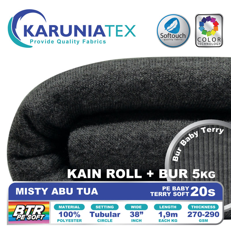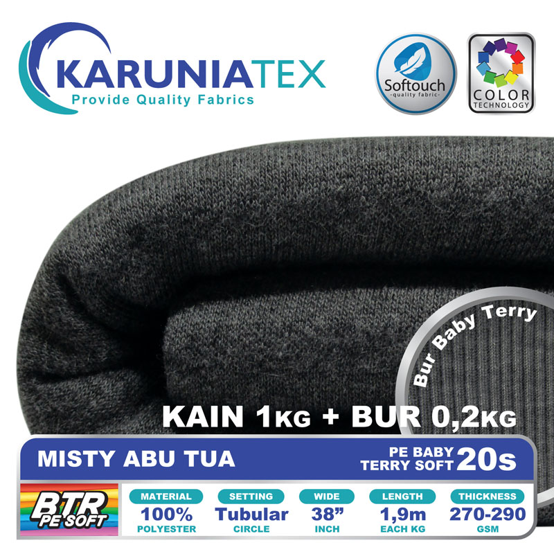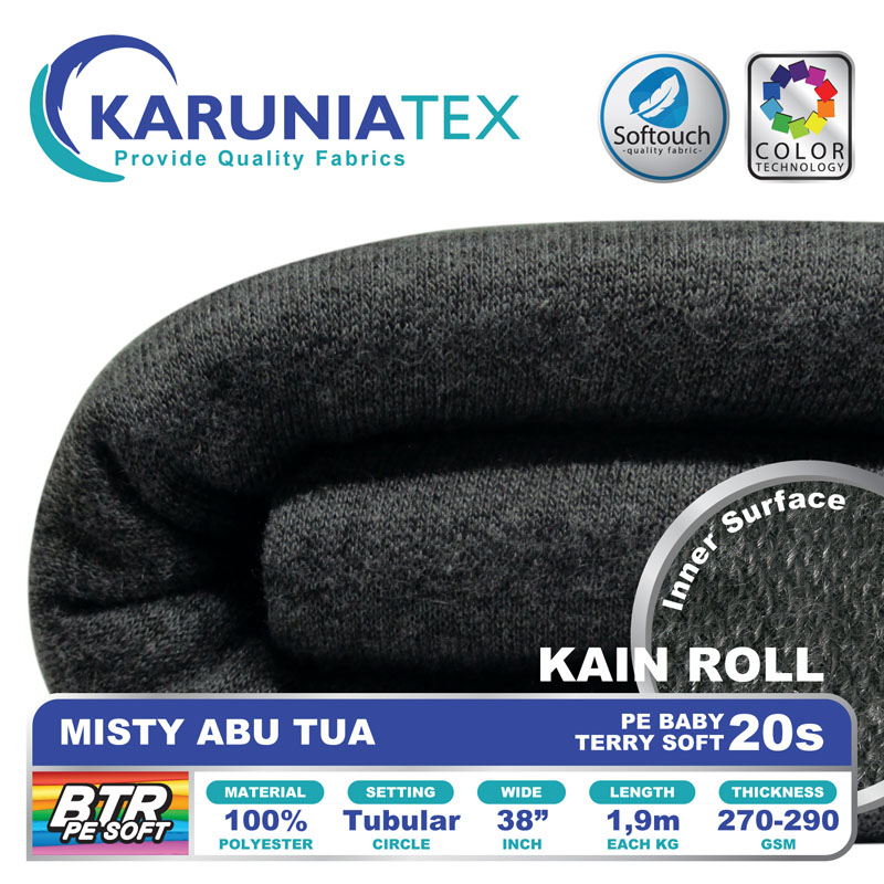 Bahan PE Baby Terry Soft adalah bahan dengan tekstur permukaan luar seperti kaos pada umumnya. Namun pada bagian dalam memiliki tekstur berbeda dengan bentuk seperti lingkaran kecil yang berulang (loop). Memiliki komposisi 100% polyester, melalui proses produksi dengan teknologi softouch membuat PE Baby Terry soft mempunyai look premium dengan karakter handfeel yang halus dan lembut.
