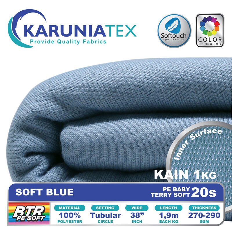 Bahan PE Baby Terry Soft adalah bahan dengan tekstur permukaan luar seperti kaos pada umumnya. Namun pada bagian dalam memiliki tekstur berbeda dengan bentuk seperti lingkaran kecil yang berulang (loop). Memiliki komposisi 100% polyester, melalui proses produksi dengan teknologi softouch membuat PE Baby Terry soft mempunyai look premium dengan karakter handfeel yang halus dan lembut.