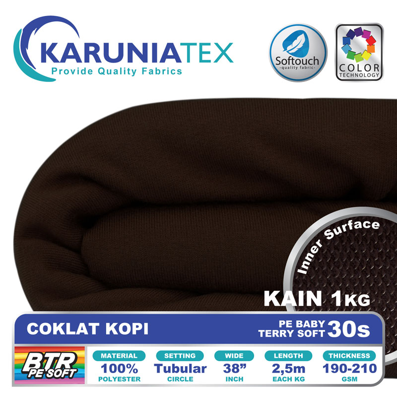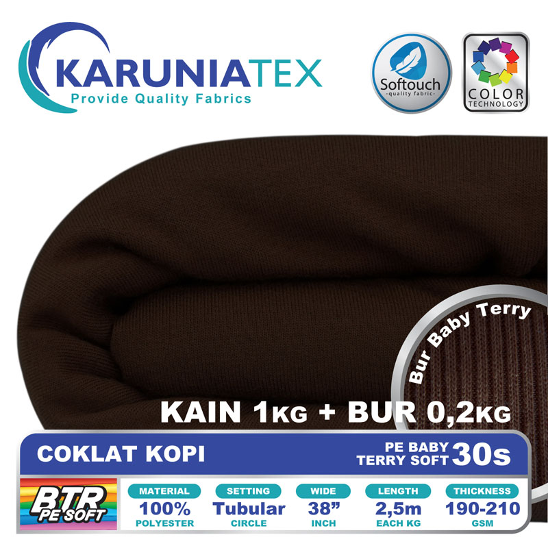 Bahan PE Baby Terry Soft adalah bahan dengan tekstur permukaan luar seperti kaos pada umumnya. Namun pada bagian dalam memiliki tekstur berbeda dengan bentuk seperti lingkaran kecil yang berulang (loop). Memiliki komposisi 100% polyester, melalui proses produksi dengan teknologi softouch membuat PE Baby Terry soft mempunyai look premium dengan karakter handfeel yang halus dan lembut.
