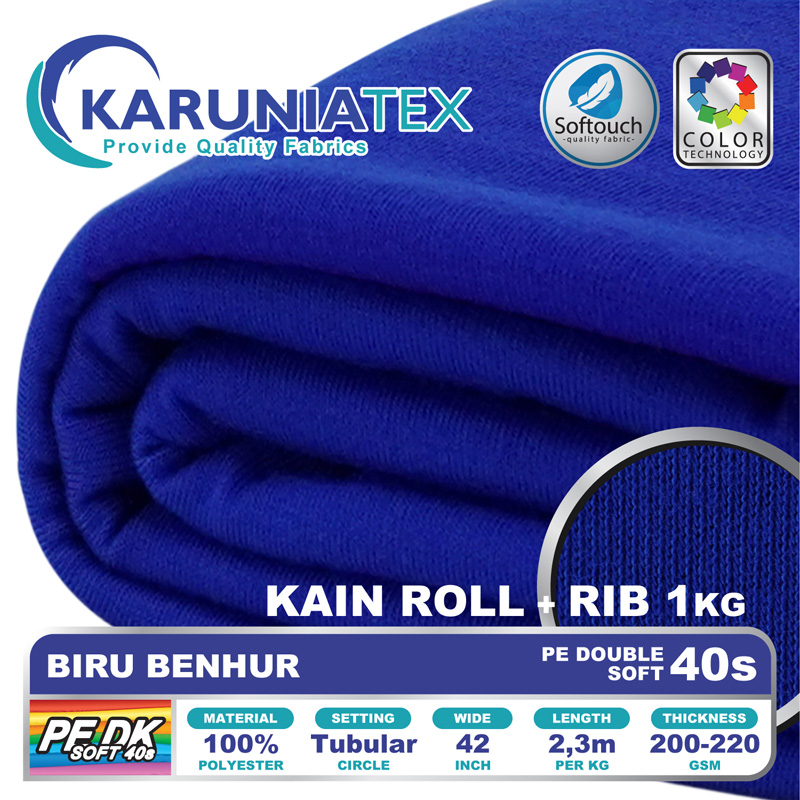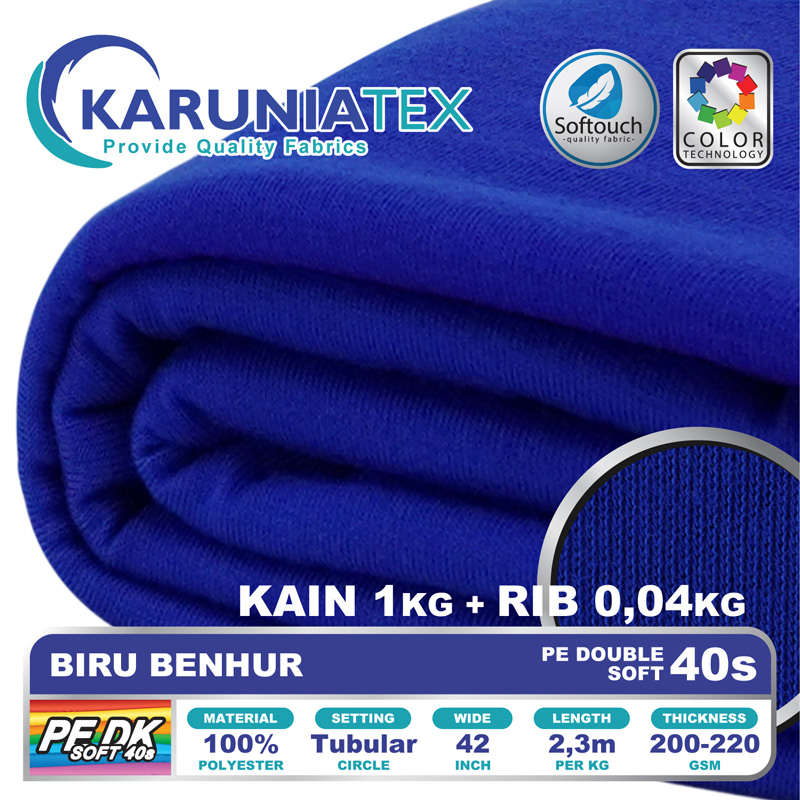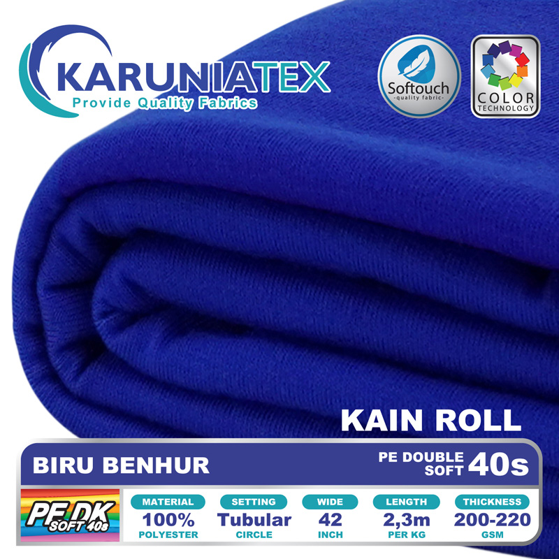 Kain PE Double Soft 40s adalah kain kaos yang terbuat dari serat high quality polyester 100%. Menggunakan teknik rajut ganda (double knitt atau Interlock) dimana kedua lapisan kain saling terhubung. Teknik rajutan ini menghasilkan kain dengan feel lebih tebal dibandingkan dengan rajutan tunggal biasa.