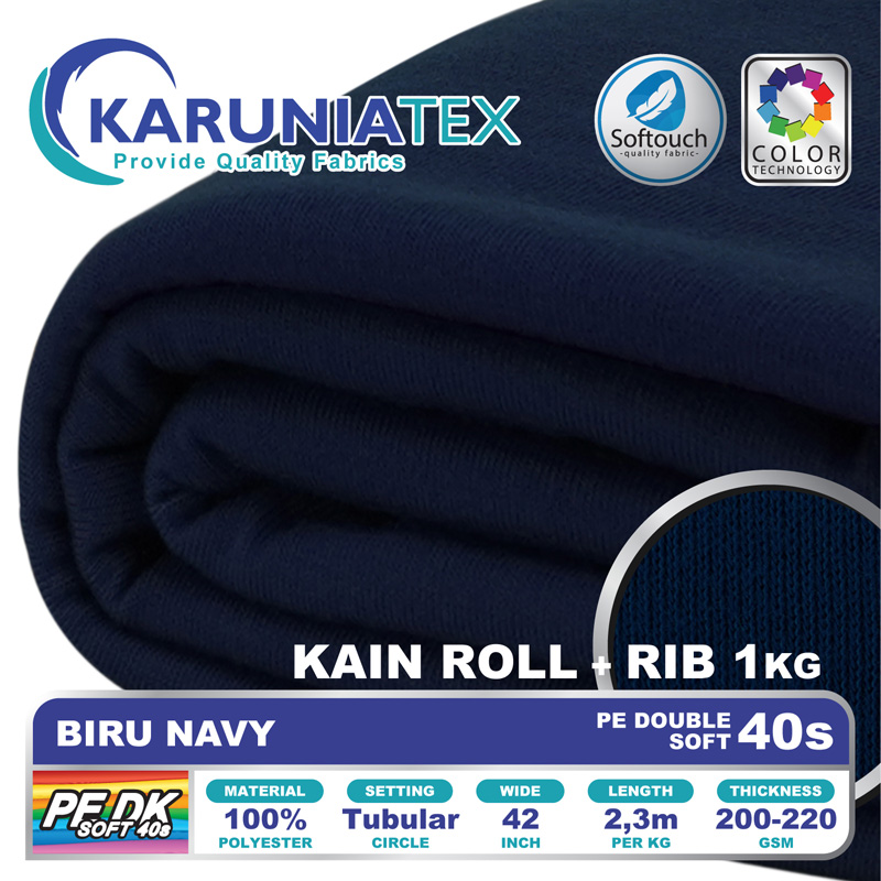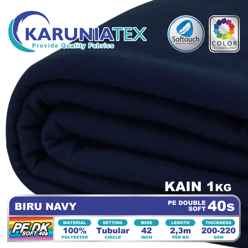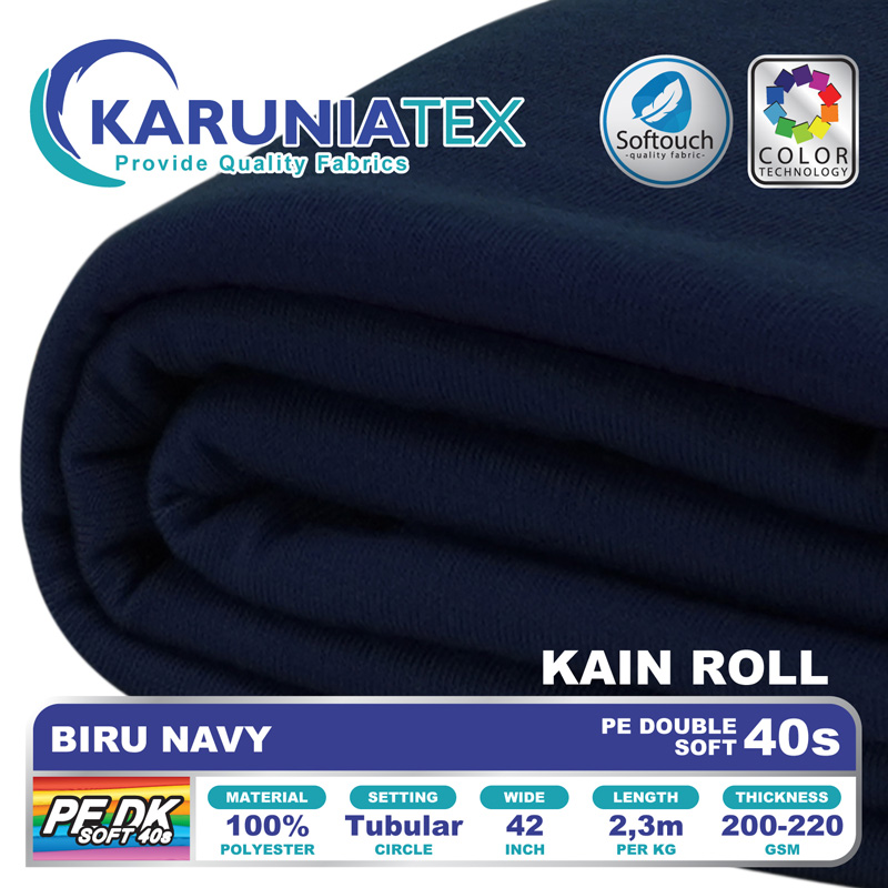Kain PE Double Soft 40s adalah kain kaos yang terbuat dari serat high quality polyester 100%. Menggunakan teknik rajut ganda (double knitt atau Interlock) dimana kedua lapisan kain saling terhubung. Teknik rajutan ini menghasilkan kain dengan feel lebih tebal dibandingkan dengan rajutan tunggal biasa.