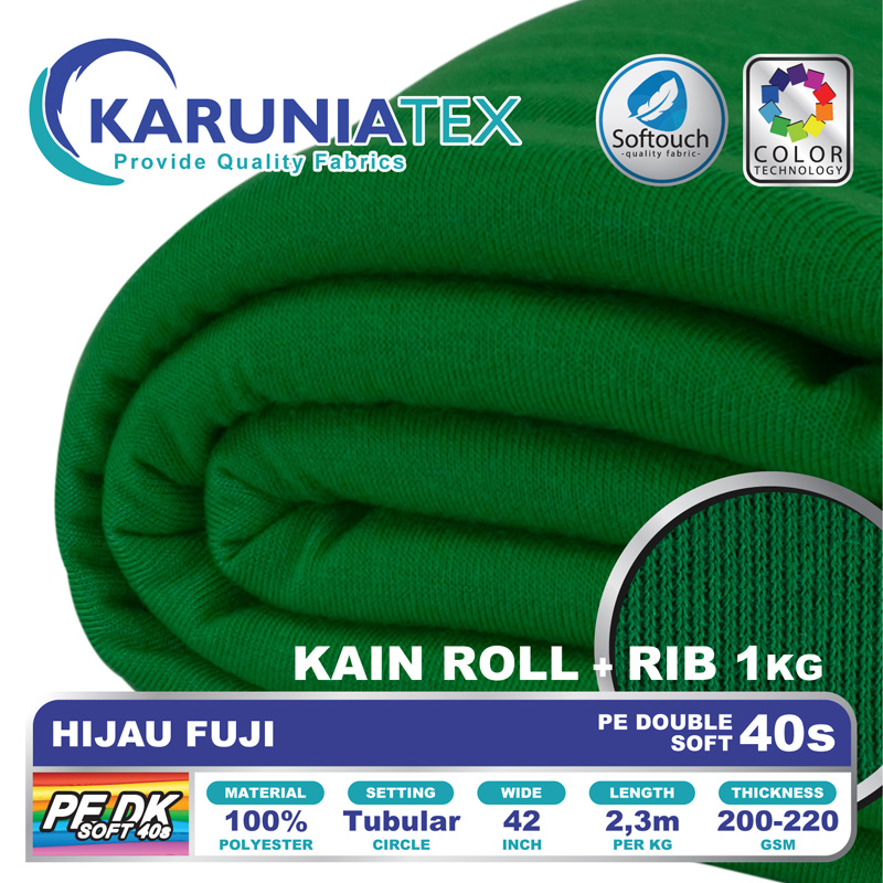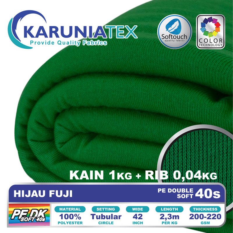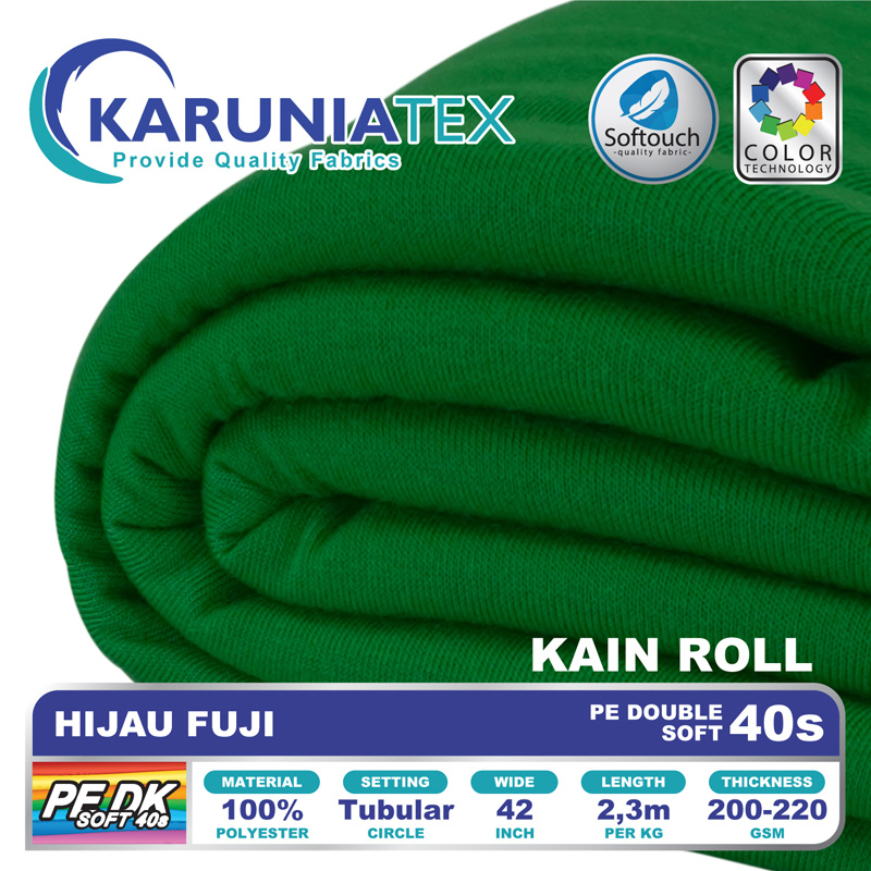 Kain PE Double Soft 40s adalah kain kaos yang terbuat dari serat high quality polyester 100%. Menggunakan teknik rajut ganda (double knitt atau Interlock) dimana kedua lapisan kain saling terhubung. Teknik rajutan ini menghasilkan kain dengan feel lebih tebal dibandingkan dengan rajutan tunggal biasa.