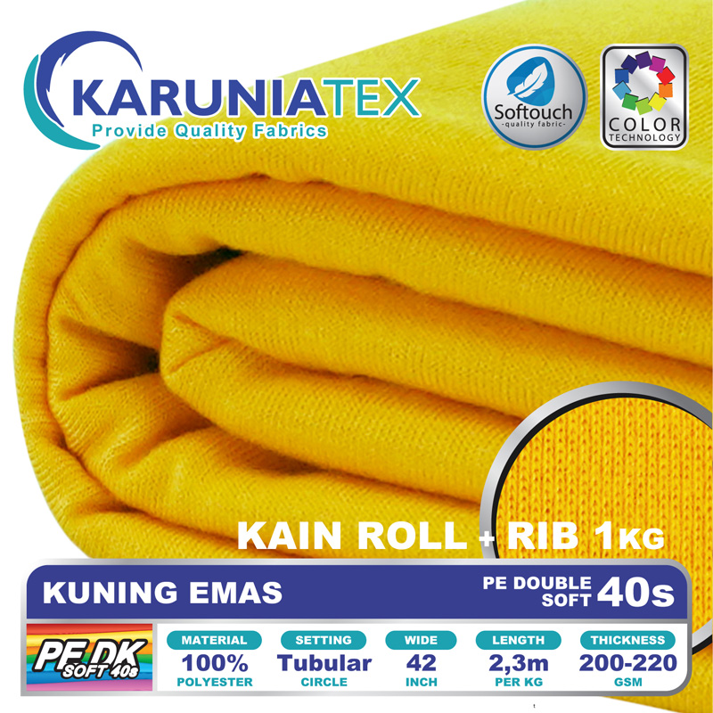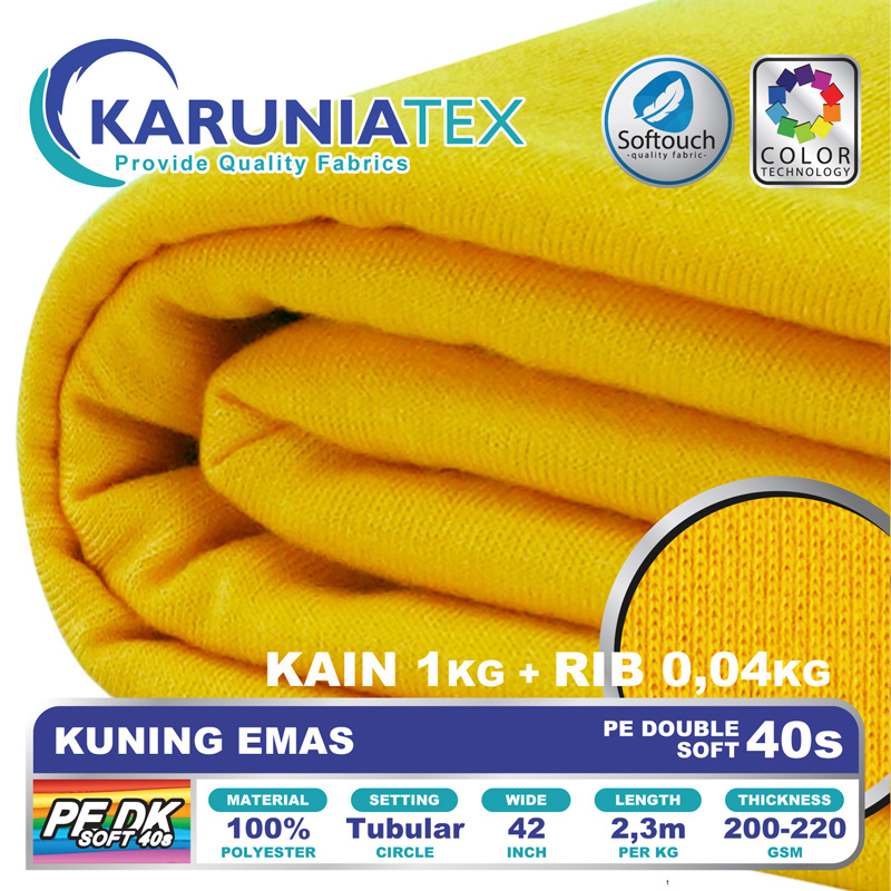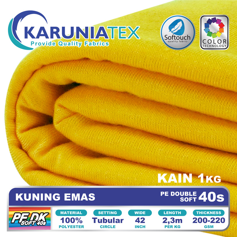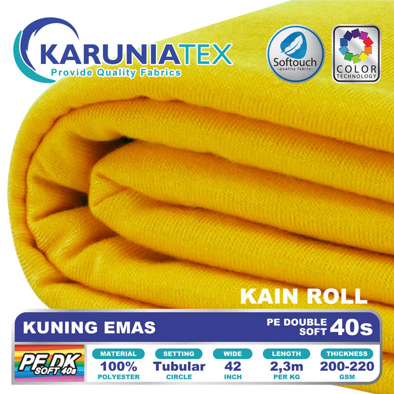 Kain PE Double Soft 40s adalah kain kaos yang terbuat dari serat high quality polyester 100%. Menggunakan teknik rajut ganda (double knitt atau Interlock) dimana kedua lapisan kain saling terhubung. Teknik rajutan ini menghasilkan kain dengan feel lebih tebal dibandingkan dengan rajutan tunggal biasa.