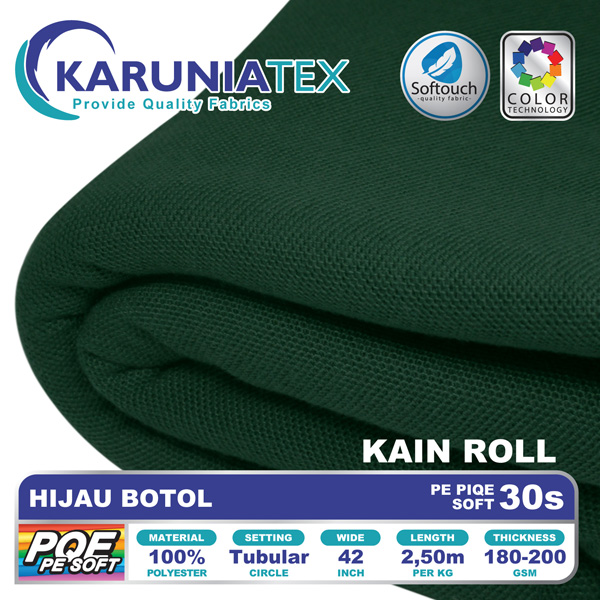 Komposisi 100% Polyester, PE Piqe Soft memiliki handfeel yang halus, lembut, warna yang cerah, pekat dan anti pudar.