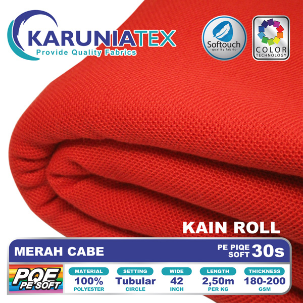 Komposisi 100% Polyester, PE Piqe Soft memiliki handfeel yang halus, lembut, warna yang cerah, pekat dan anti pudar.