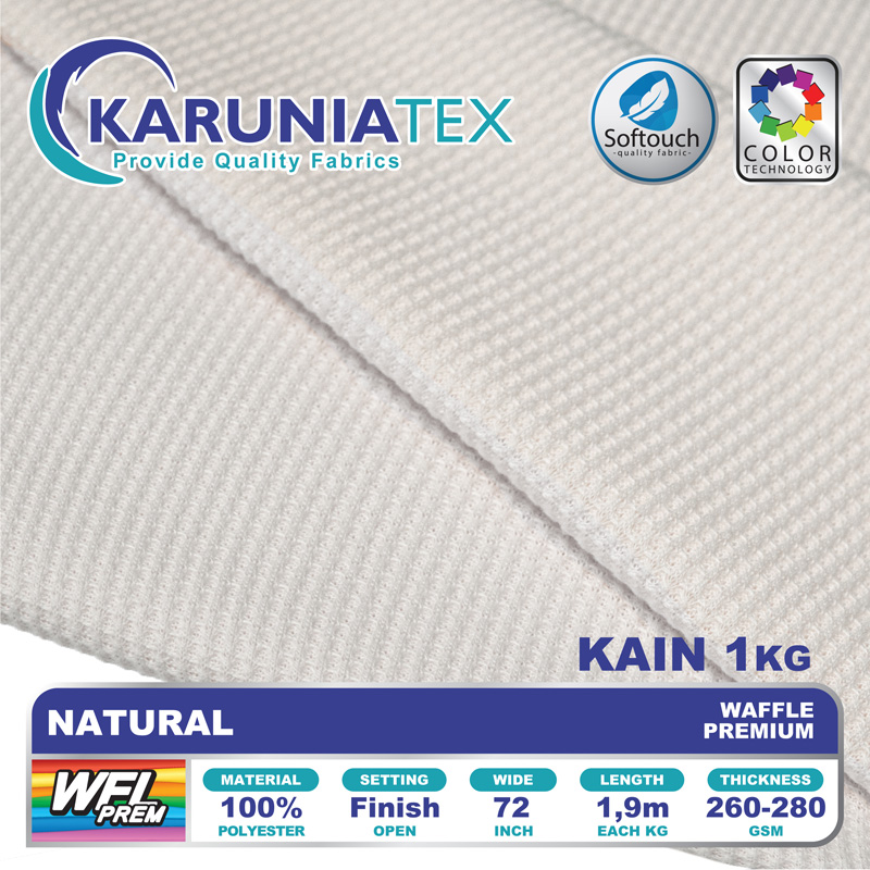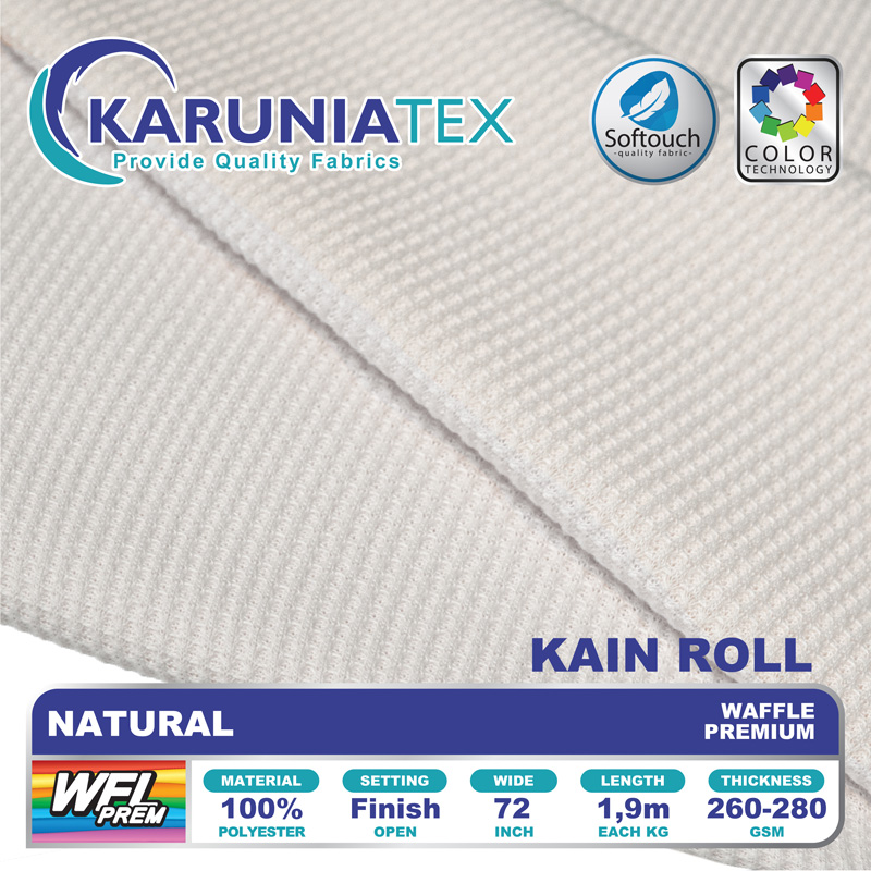 Kain Waffle Premium merupakan kain dengan pattern kotak-kotak menyerupai kue waffle. Memiliki karakteristik kain yang tebal namun breathable sehingga adem saat kita pakai, kain ini juga tidak mudah kusut, tidak menerawang, handfeel halus dan lembut khas produk Karunia Textile.